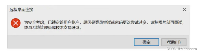 通过远程桌面连接Windows实例,提示“为安全考虑,已锁定该用户账户,原因是登录尝试或密码更改尝试过多”错误的可能原因和解决方案。