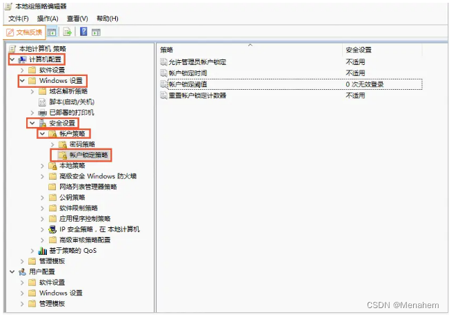 在本地组策略编辑器页面中,选择计算机配置 > Windows设置 > 安全设置 > 账户策略 > 账户锁定策略。