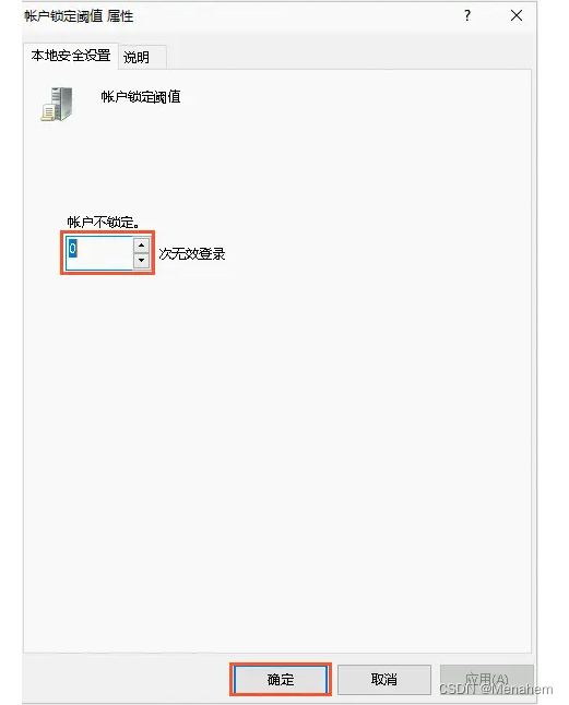 在账户锁定阈值 属性窗口,将账户不锁定阈值修改为0,单击确定。